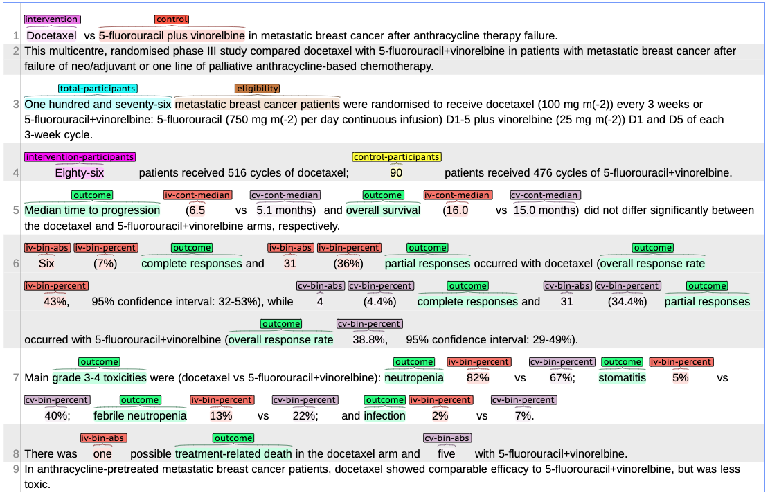 We created a corpus consisting of abstracts of breast cancer randomized controlled trials (RCTs) extracted from the PubMed database. We annotate the core components of clinical trials, i.e., Participants (P), Intervention (I), Control (C), and Outcome (O), commonly known as the PICO elements. For each component we annotate text snippets that describe them.