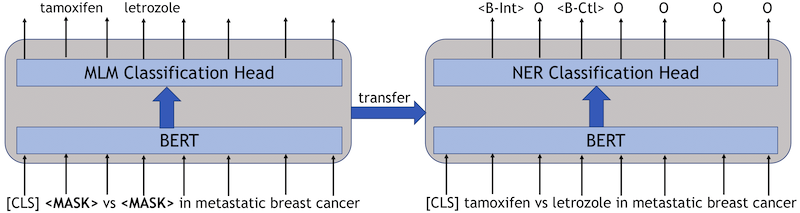 The information extraction is a named entity recognition (NER) task. We train three BERT-based NER models; BioBERT, BlueBERT, and Longformer. We use the standard BERT-based models for token classification as provided by huggingface. Since neural network models provide different results when initialized with different seeds, previous research suggests using different seeds and averaging the results. The code for token classification using BERT models can be found here.